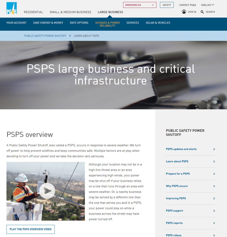 Working with Digital Strategies and the PSPS PMO, I initiated and project managed the creation of the PSPS critical infrastructure webpage, designed to provide large businesses and critical customers with various self-help PSPS resiliency tools and resources in one place. Customers and the CPUC have praised this webpage. Other California investor-owned utilities. have also mimicked this webpage.